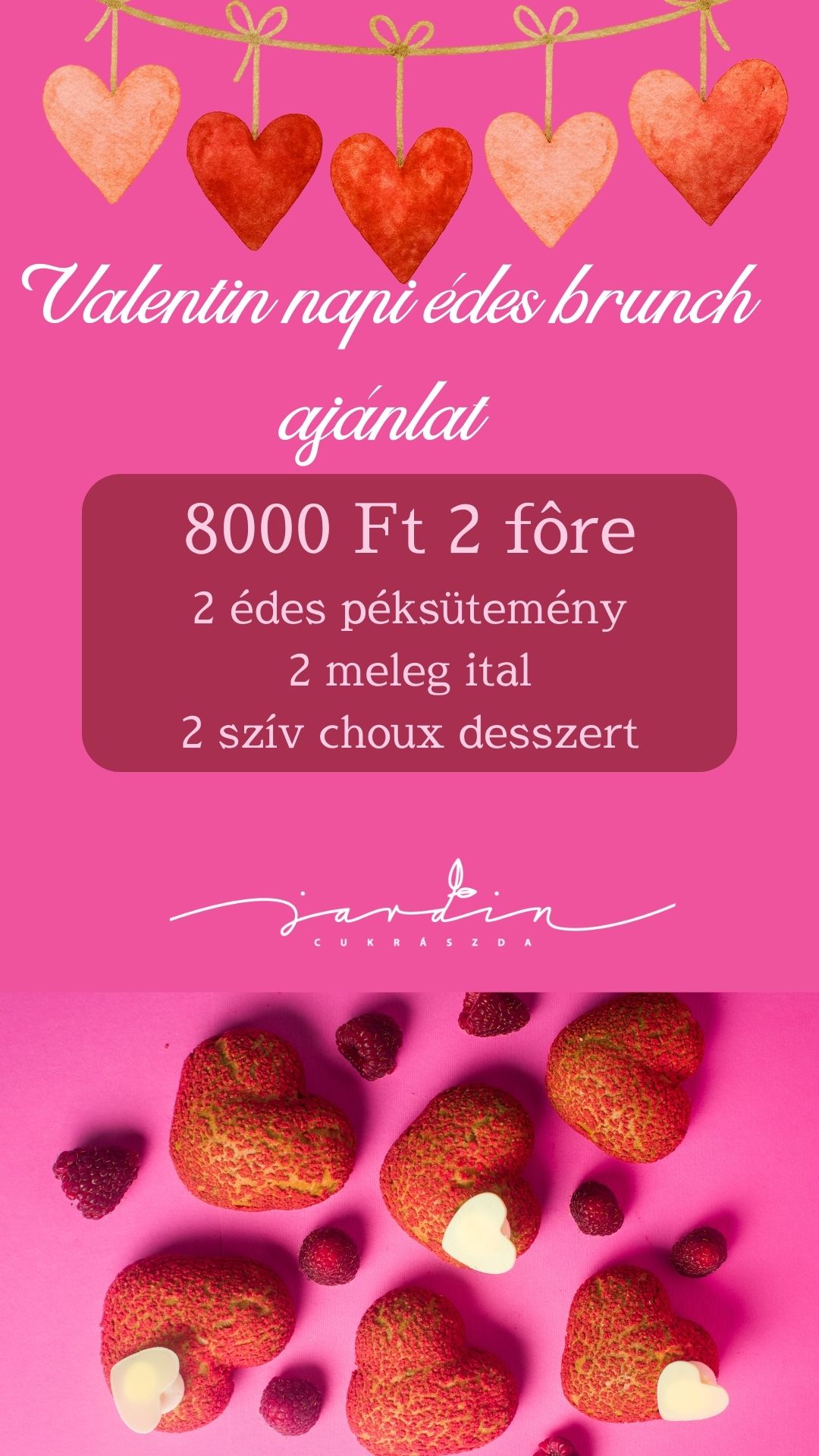 Kezd a Valentin napot egy édes reggelivel. Kávé, Jardin péksütemény és természetesen egy Jardin desszert vár rátok. Garantált a romantikus hangulat. Megjegyzésbe kérlek írjátok bele, hogy mikor érkeznétek.